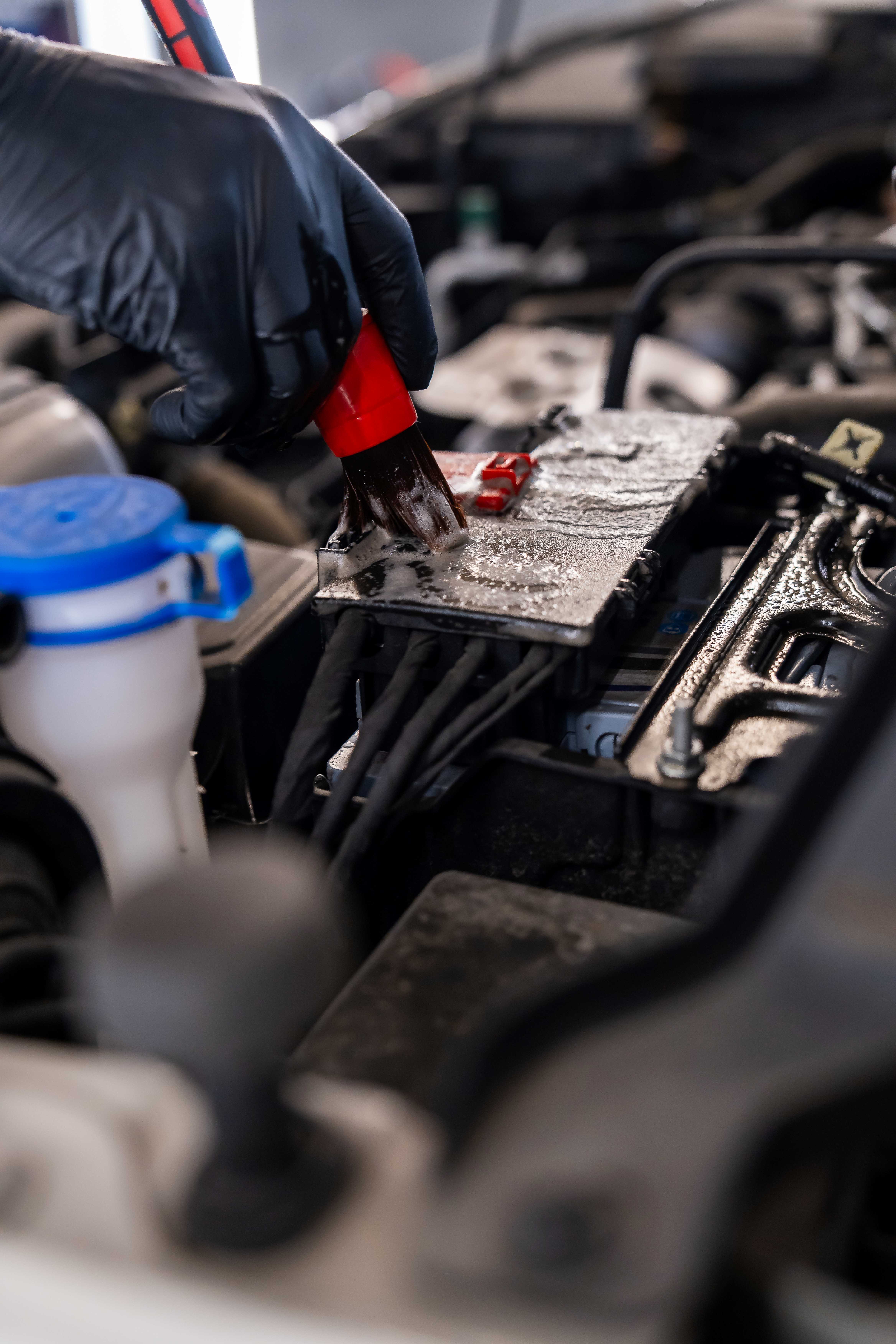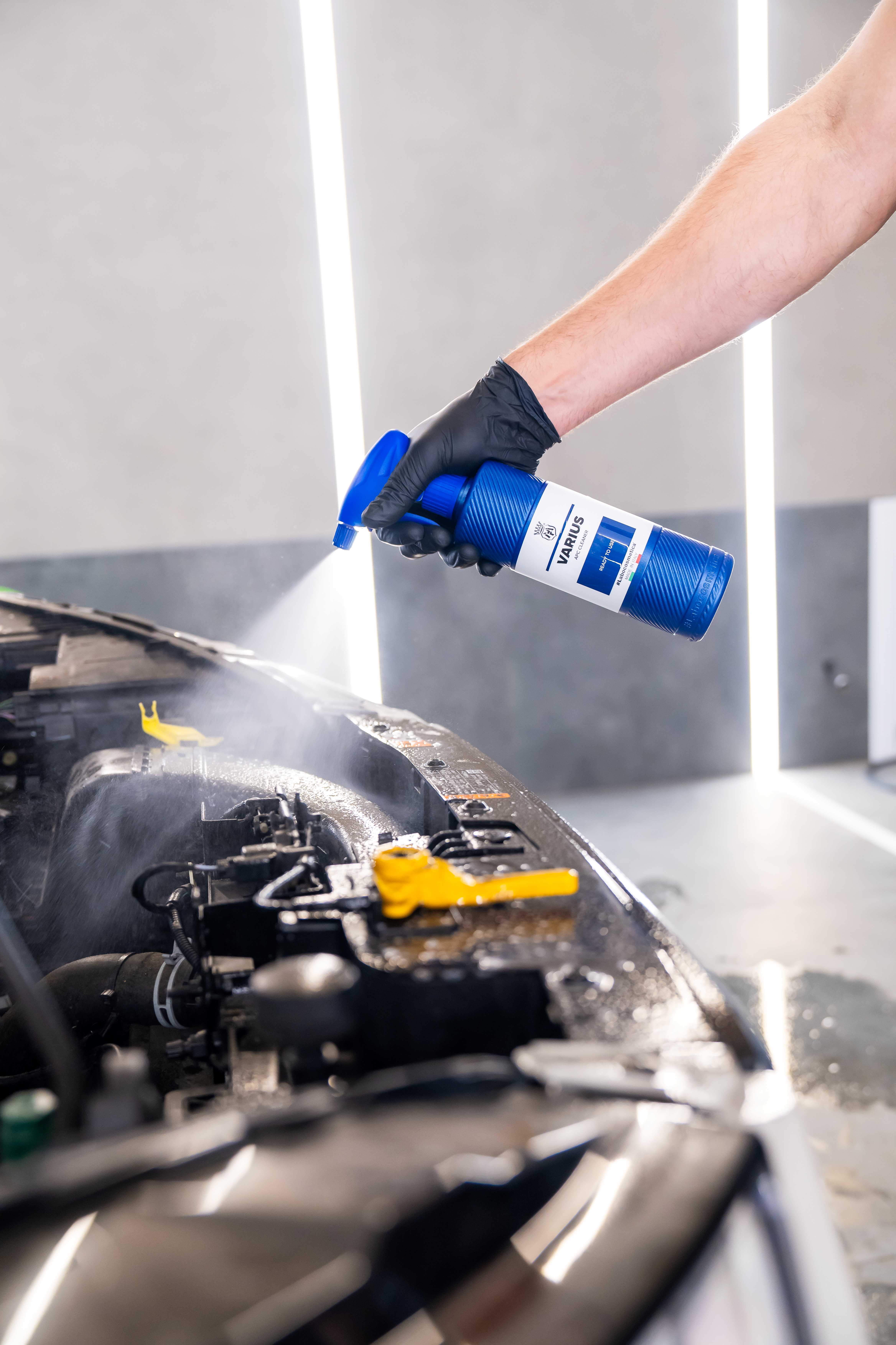2. Applicera medel i hela motorutrymmet och även på motorhuvens undersida. Låt medlet verka upp till 5 minuter. Vi rekommenderar Mafra HP12. En extremt effektiv olje- och fettlösare som löser all typ av smuts som brukar finnas i ett motorutrymme. Även Ductile är mycket bra vid motortvätt vid lite lättare smuts. Är det extremt smutsigt och tjocka lager med skit kan man behöva hjälpa till med en borste för att lösa upp smutsen. Använd en lite hårdare borste som Work Stuff Brush Black eller Black Stiff om det är riktigt smutsigt.