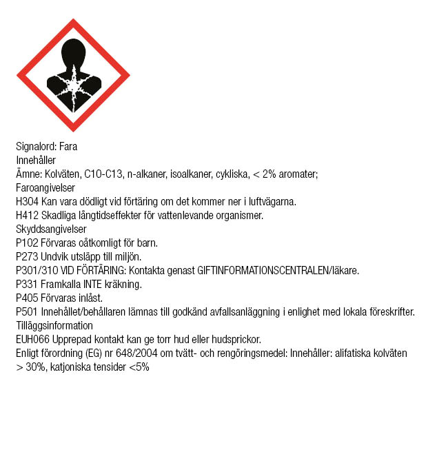Snabbverkande, förstärkt lågaromatisk kallavfettning. Löser asfalt, tjära och olja.