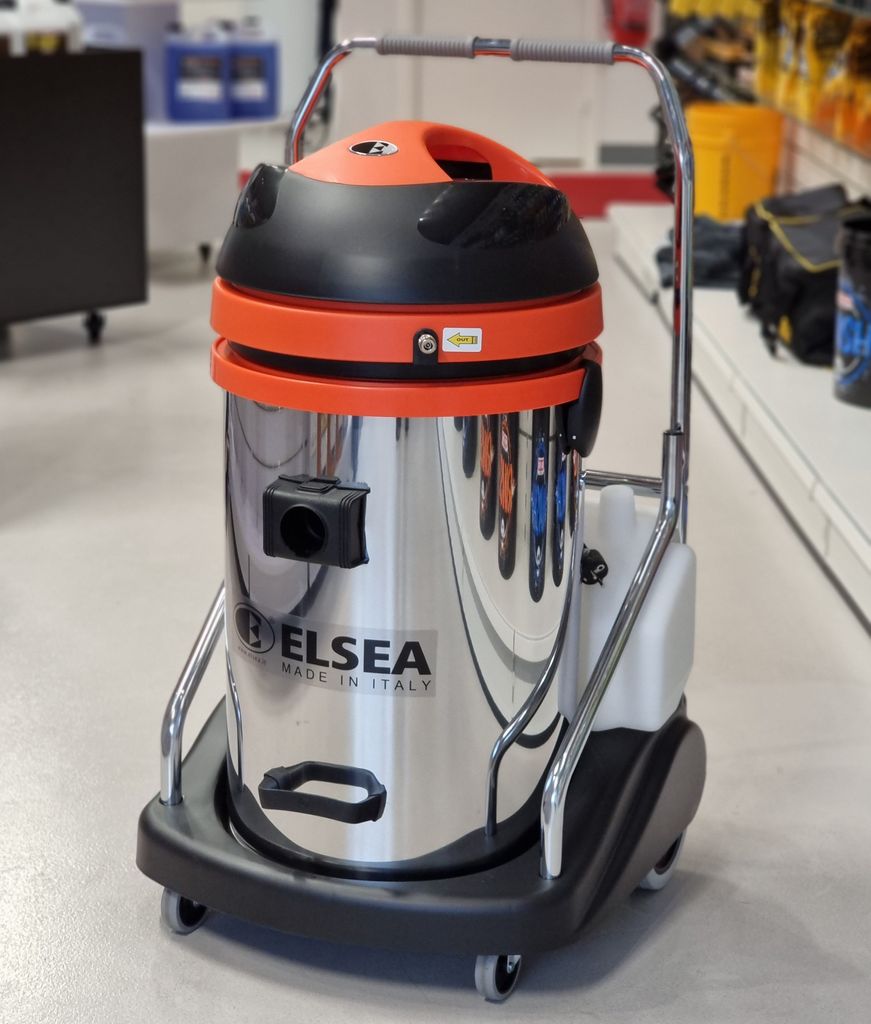 Tvåmotorig klädseltvättsmaskin för professionellt bruk med 77 liter rostfri tank, värmefunktion upp till 90 grader, 20 liters vattentank och rostfritt fogmunstycke.