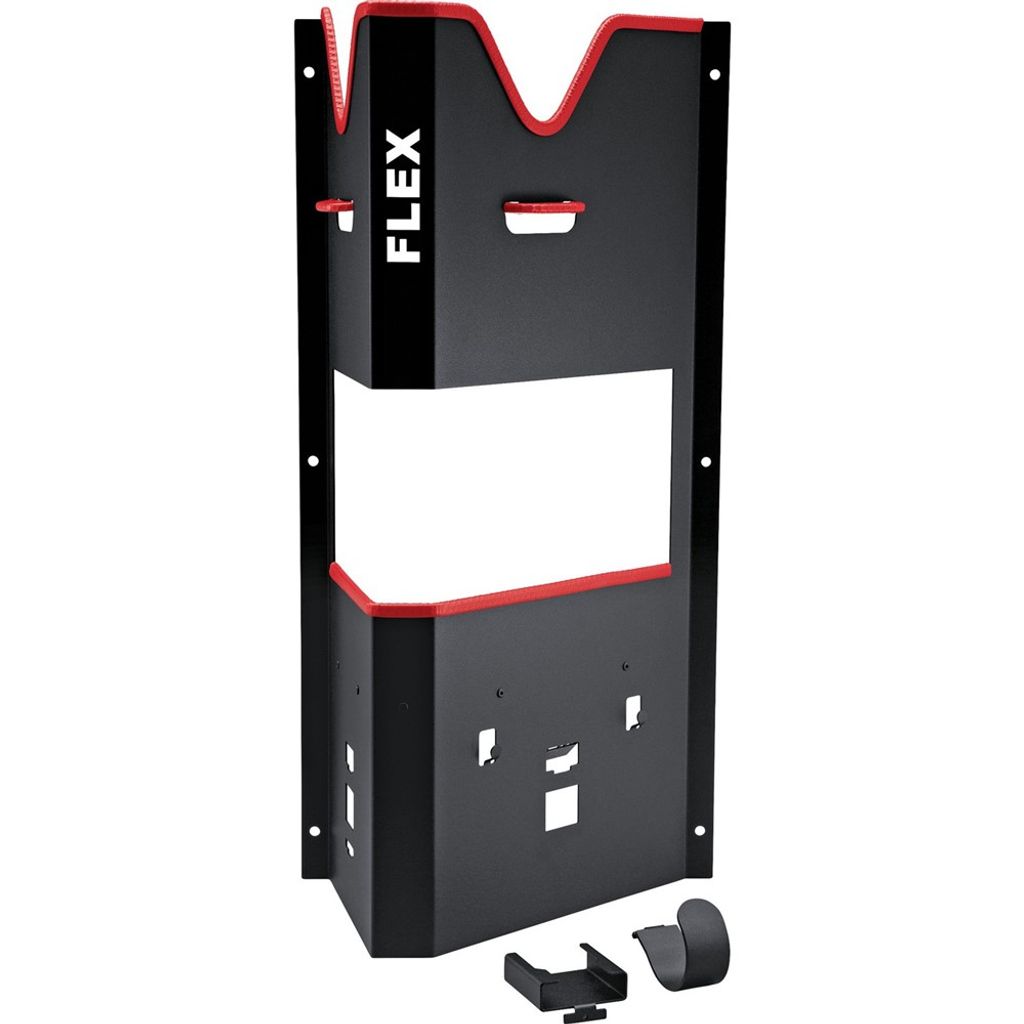 Stor vägghållare för Flex polermaskiner. Fack för polermedel, hållare för laddare och batteri och kabelhållare.