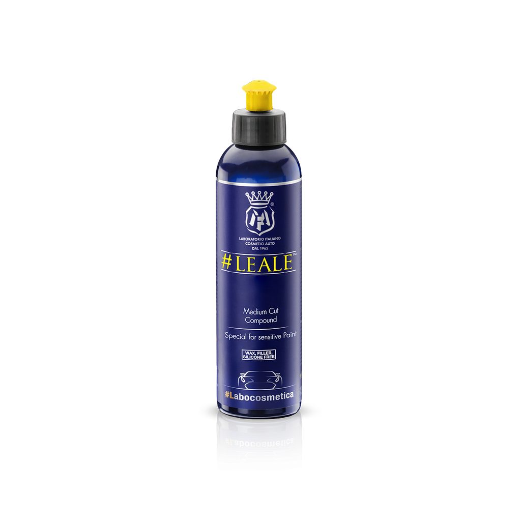 Labocosmetica Leale är en inovativ, förfinad, silikonfri och vattenbaserad medium polish. Den innehåller syntetiska slipmedel som anpassar sig efter underlaget, även efter de mest känsliga underlagen som vanligtvis brukar vara en mardröm att polera som mjuka, klabbiga mörka lacker. Den tar effektivt bort märken efter felaktig tvättning, hologram, polerrosor och sliprepor från P2500 även på hårda keramiska lacker. Leale lämnar extrem glans och ett perfekt resultat.