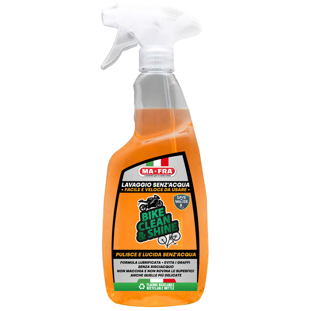 Bike Clean and Shine är en produkt som rengör samtidigt som den lämnar en hal, blank och skyddad yta efter sig. Lätt att använda, doftar gott och kan användas på alla olika ytor på motorcyklar och cyklar. Dess lubricerande formula garanterar en säker rengöring utan att repa eller lämna märken.