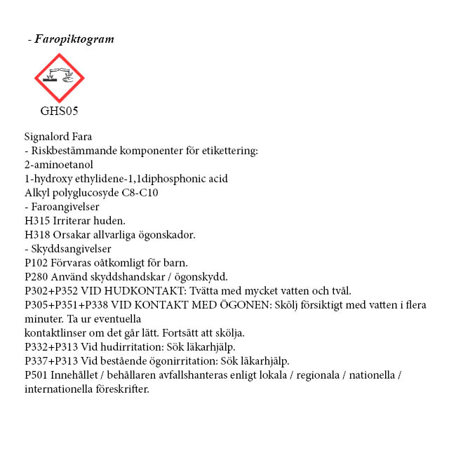 Bruksanvisning: Späd produkten 1:15-1:20 med vatten. Spraya på den delen som ska rengöras och vänta cirka 30 sekunder. Spola sedan med högtryckstvätt.