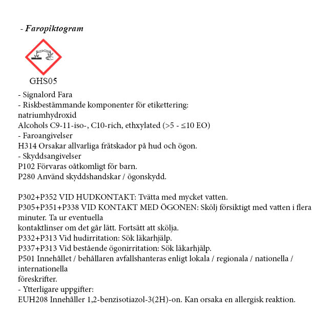 Vid användning i pumpspruta, vid vintertvätt, blanda 1:30-1:40 (1 del medel, 30-40 delar vatten). Vid sommartvätt, blanda 1:50-1:60 (1 del medel, 50-60 delar vatten). Spraya på hela bilen, vänta cirka 1 minut och spola av med högtryck, nedifrån och upp. Låt inte medlet torka.