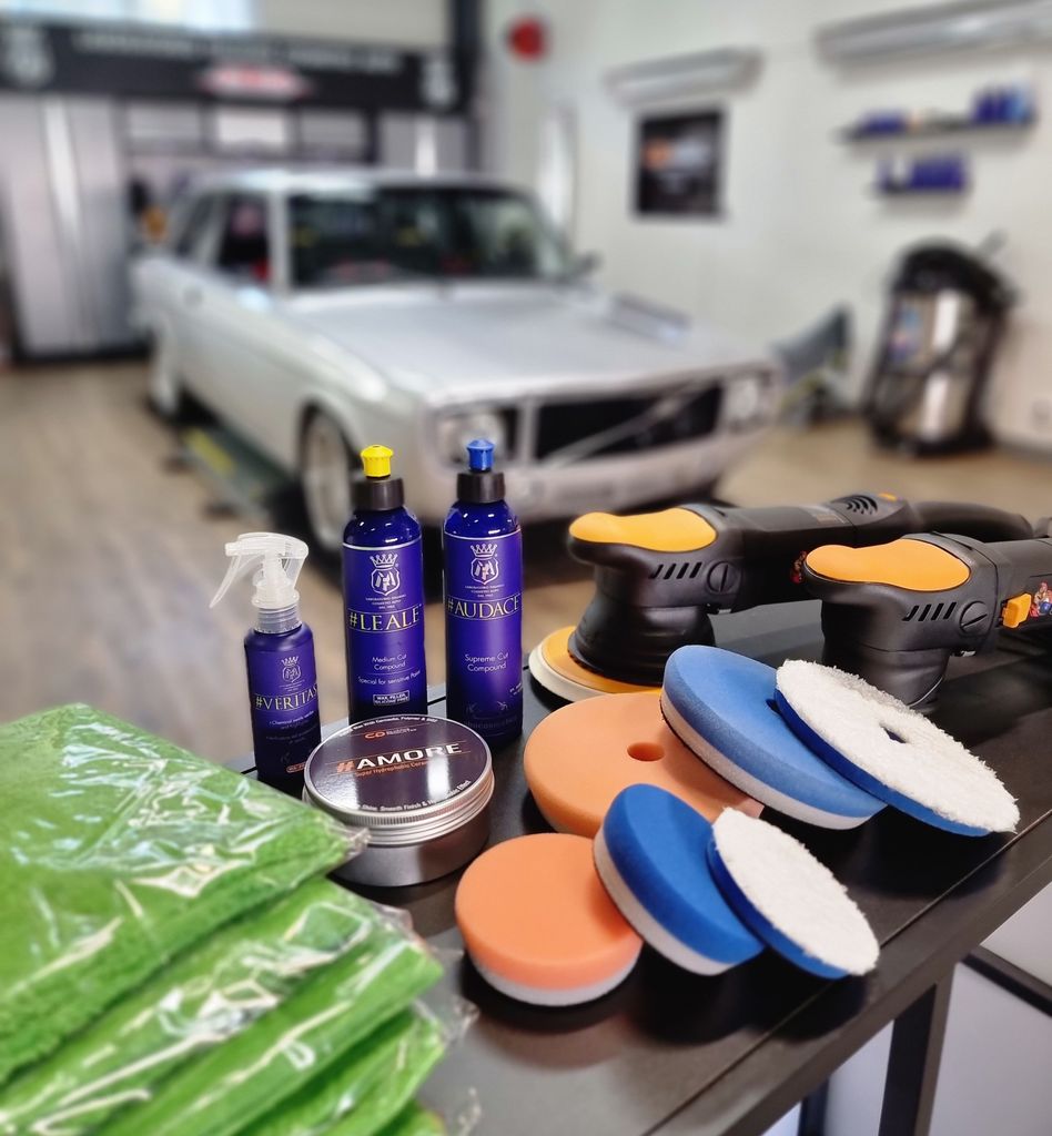 Paket med polermaskiner, polermedel, pads, vax och mikrofiberdukar.