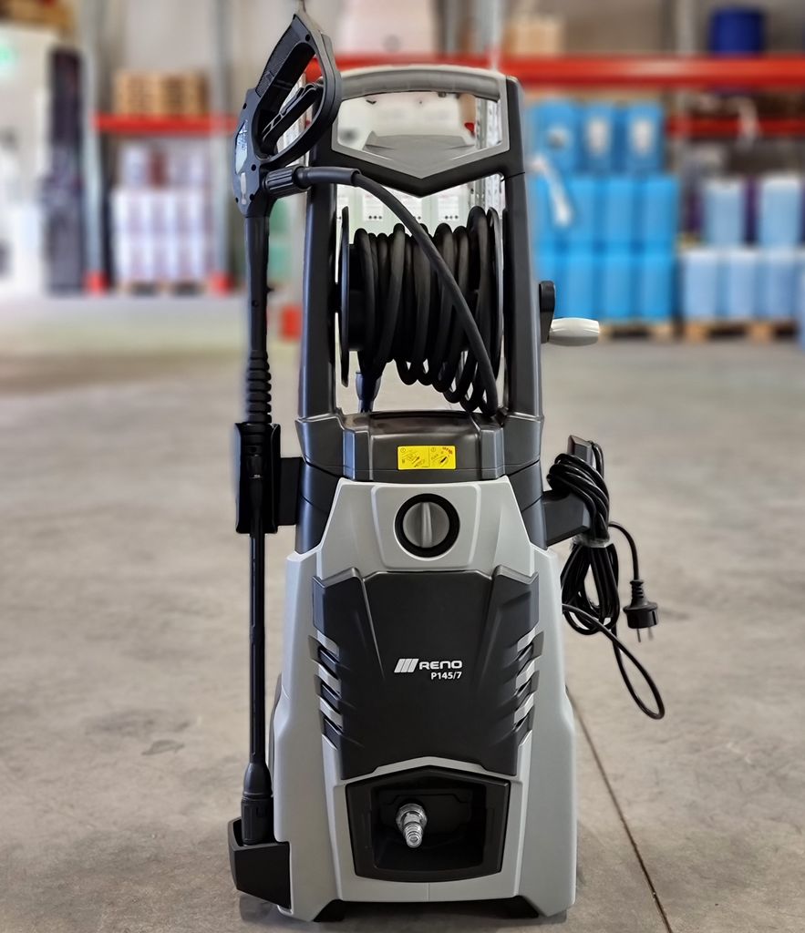Maskinen är försedd med en fin rejäl Högtryckslang (1/4 tum) upprullad på en manuell vinda. Skön ergonomisk pistol med två olika lansar. En klassisk högtryckslans med ställbar spridning s.k Vario-Jet, och ett roterande munstycke för tex rengöring av plattor, trall etc. Maskinen är även bestyckad med en injektor + behållare för att kunna applicera kem, tex schampo eller skumtvättmedel (foam). Reno 145-07 är designad i Danmark och har en Italiensk Annovi-pump som ger 145 bars tryck och ett vattenflöde på 7,5L/min. Vill man montera en Foam Lance på lansen så ska du använda M22 Kränzle / Reno nr. 8 (se KOPPLINGAR FOAM LANCE)