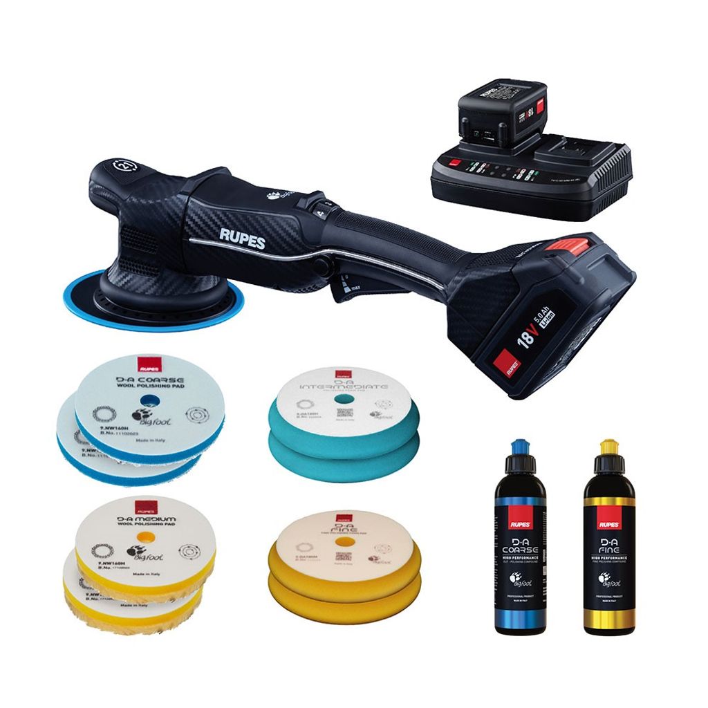 HLR15/BAS-kit levereras med 1 maskin, PrecisionPro stödrondell 150 mm (art nr: 981.710), 2 batterier, 1 dubbelladdare, 4 ulltrissor, 4 skumtrissor, 1 st 250 ml DA coarse, 1 st 250 ml DA fine polermedel.