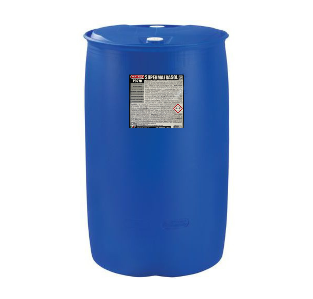 Med sin enormt kraftfulla rengöringseffekt är SUPERMAFRASOL en marknadsledare. Effektiv även vid låga doseringar med hårt vatten. Den tar enkelt bort svår smuts utan att skada underlaget t.e.x fett, olja, sot, insekter, diesel etc. Med dess antistatiska egenskaper och balanserad skumbildning, blir den mycket lätt att skölja av. Perfekt att användas på bilvårdsfirmor, lastbilstvättar, automatiska biltvättar etc. Innehåller lätt nedbrytbara tensider. GÖR SÅ HÄR: 1 del produkt till 30-80 delar vatten, beroende på användningsområde. Vill man ha ett starkt medel till fälgar/däck kan man öka doseringen till 1/10. Applicera brukslösningen nedifrån och upp. Använd lågtryckspruta. Vänta några minuter, skölj sedan av.